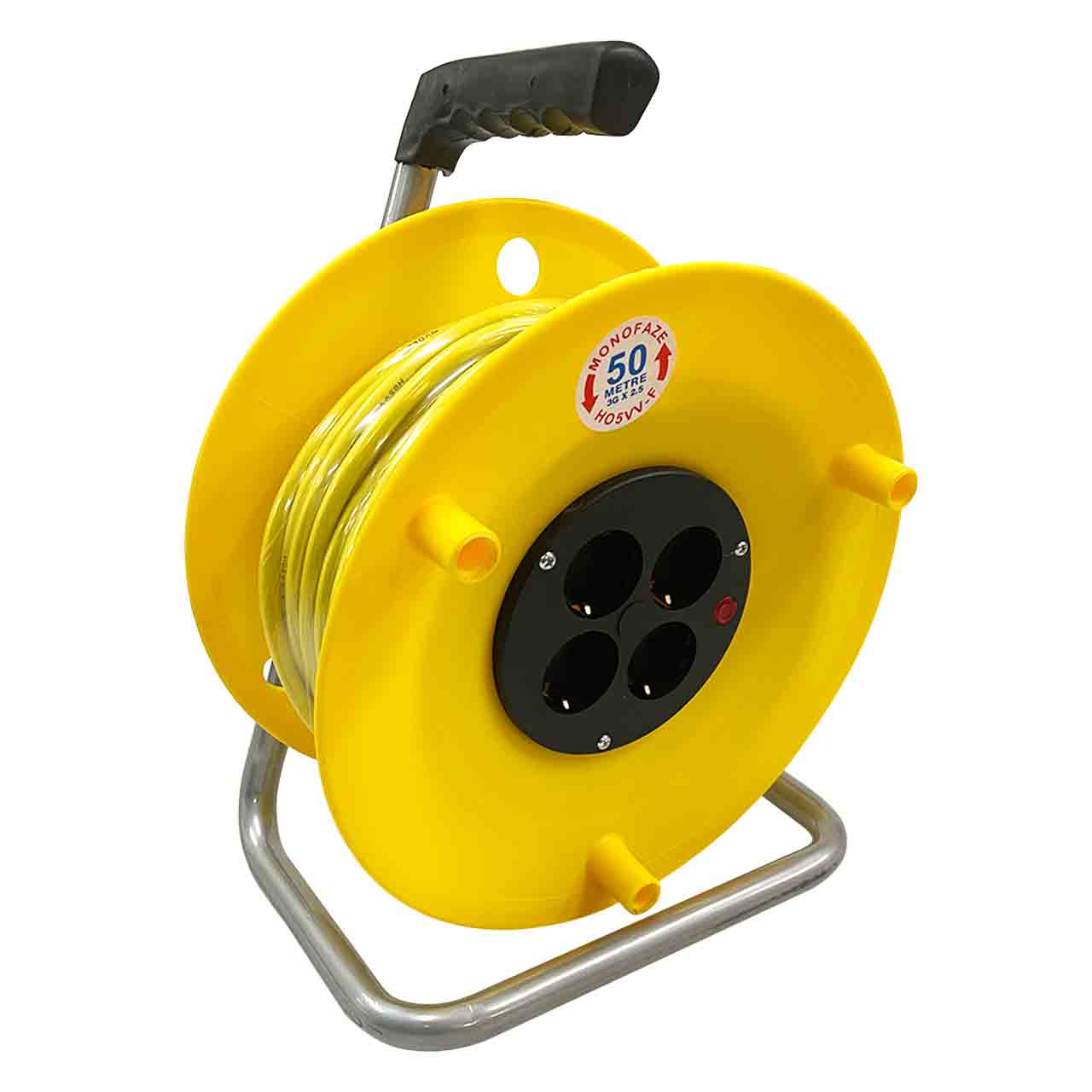 Силовой удлинитель 3x2,5 50 м представляет собой катушку из АБС-пластика, с четырьмя розетками имеющей диаметр 260 мм с намотанным проводом. Это удобное приспособление для защиты длинного провода от спутывания, его хранении и транспортировки.