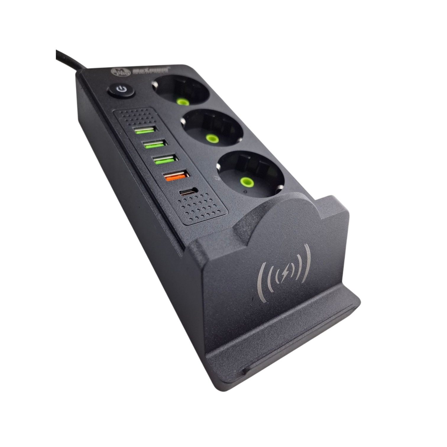 Удлинитель сетевой черный с бепроводной зарядкой 3 метра, 3 евро розетки, 4 USB порта, Type C, 2500W