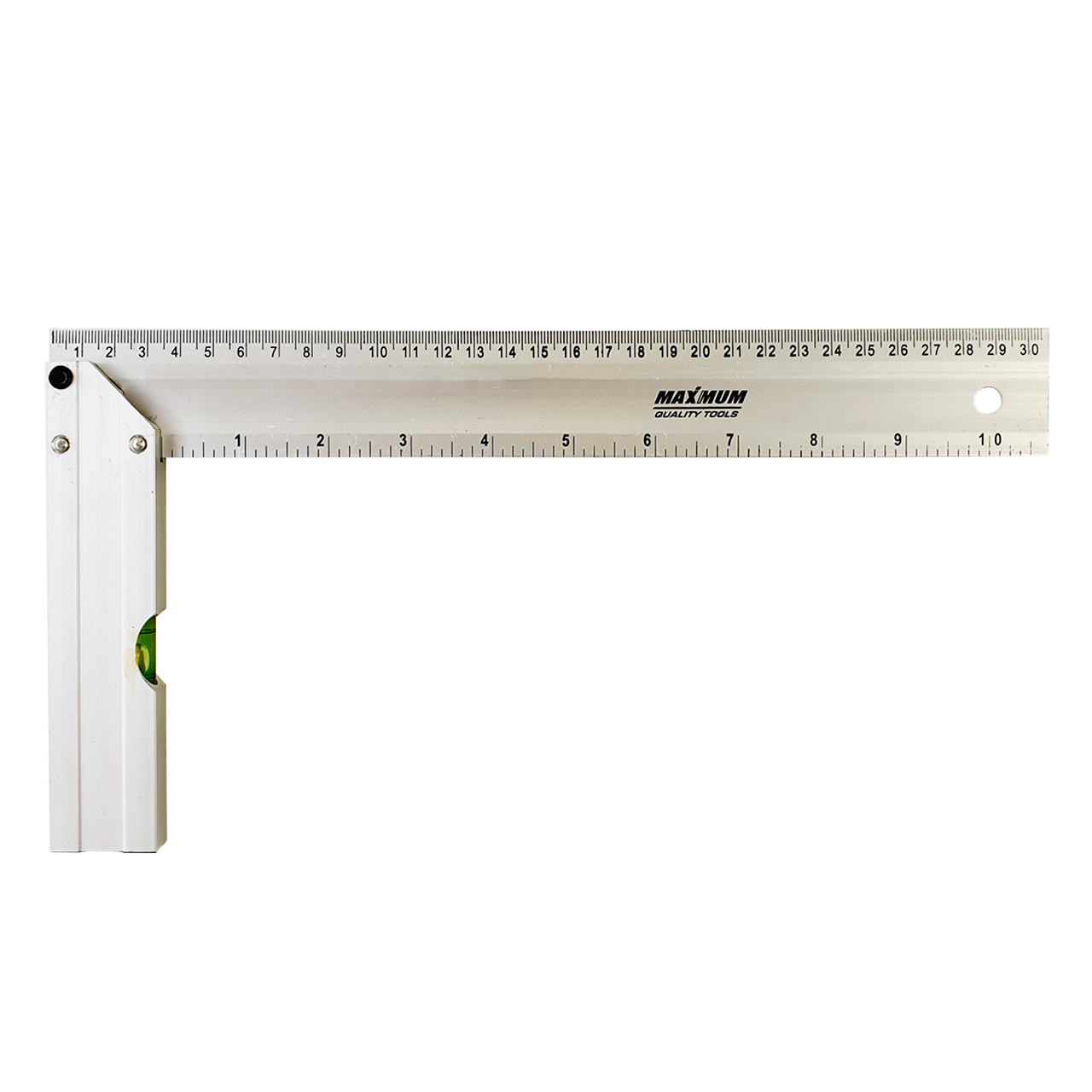 Литой алюминиевый угольник-линейка 300 мм от «Maximum» дополнен пузырьковым уровнем на ручке. Инструмент позволяет контролировать внешние и внутренние прямые углы соединений и деталей, осуществлять разметку поверхностей. Угольник оснащен яркой разметкой сантиметры/дюймы для определения расстояния и способен определять углы 45 и 90 градусов.
